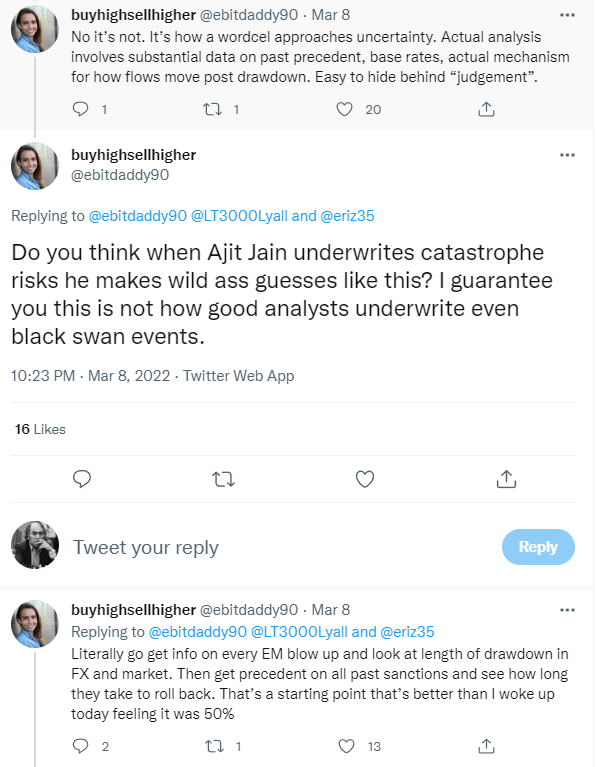 Despite drawing down substantially from their peak, the thesis was summarized by “90% chance Russia opens back up and everything gets back to normal, 10% chance that it goes to zero” which is exactly the sort of lazy thinking that you’d expect from an equity investor that is dabbling their feet in investing internationally. Below is the correct response to this analysis from a good analyst: