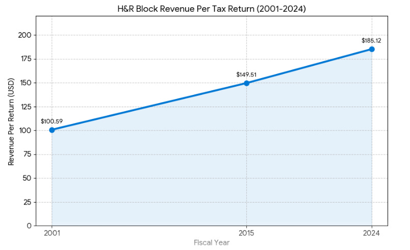 H&R Block prepares tax returns and offers auxiliary services to its clients. The company and its 10,000+ retail locations has assisted in the preparation of around twenty million tax returns per year for 25 years despite stiff competition from TurboTax, the federal government (1040-EZ was retired in 2017, but still). No real growth in the numbers, but still, the whole tax prep ecosystem seems to have a permanent class of 20 million people who demand H&R Block’s services, with revenue per return CAGR’ing at 2.7% per year for 23 years: