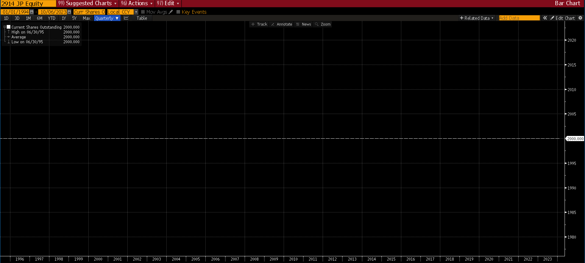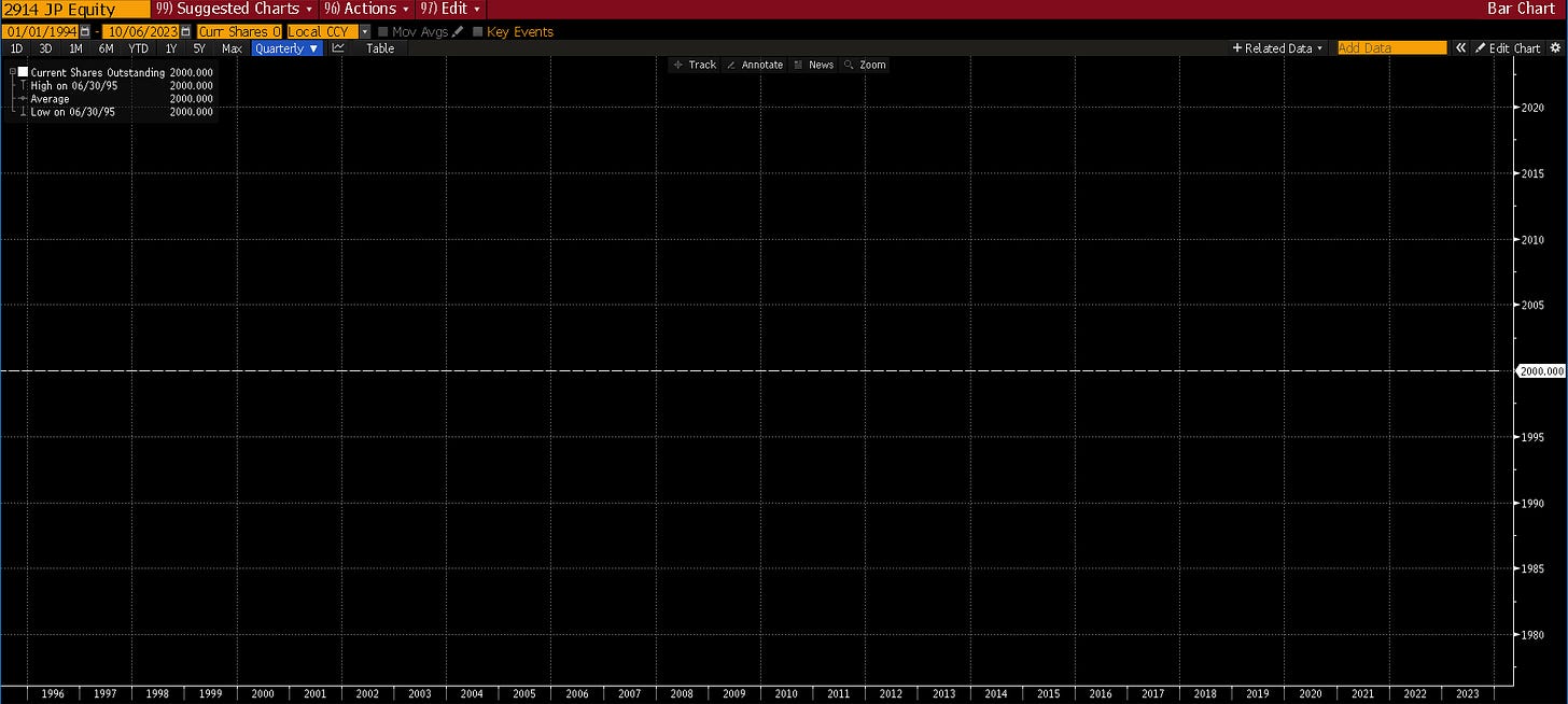 Here’s a funny chart from the name that has sold off the least (mostly because of FX), Japan Tobacco Inc. The company has had exactly 2 billion shares out standing for at least 28 straight years! Japanese tidy-mindedness at its finest.
