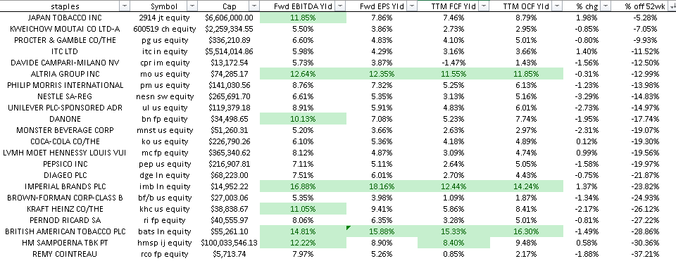 In the previous note I talked mostly about broader market valuation and rates, which isn’t a subject I spend that much time thinking about. But the genesis of it stems from finding a quit rate: basically I want 10% return after tax, I can get that in a staples name that I trust (Nestle or Coke or whatever). But I really only want that 10% forward total return at a discount, whether it be 10 or 20 cents- nothing too crazy. A reasonable price for a Nestle would probably be 80 francs or so, an implied EV of ~272 billion francs for a company earning ~16 billion or so in EBIT. Hardly a bargain but certainly a price I’d go to the beach at! I bring this up as its the first time that price is within spitting distance of the actual market price. In fact, most staples names I follow have seen this move in long-term interest rates demolish their forward multiples, deservedly so: