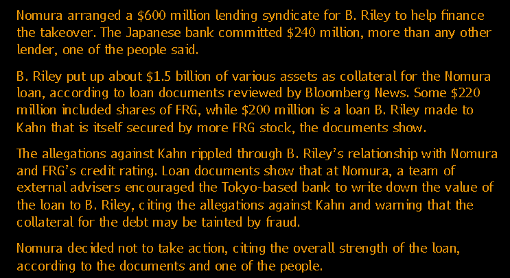 Why wait to file charges against Kahn? It’s been 3 months since the settlement- the testimony is right there? Unless, maybe, the case is just a matter of he said/he said. So we’ll see: the base case I see is RILY taking a loss on this $200M secured loan to Vintage’s FRG shares per some future civil litigation against Kahn. I don’t see this as a deathblow. It also sounds like RILY could have been a victim: why did RILY loan on Vintage’s FRG shares knowing there was a potential legal blowback? Why double-down knowing one of your “co-conspirators (Hughes)” was rolling on Kahn? Doesn’t make much sense.