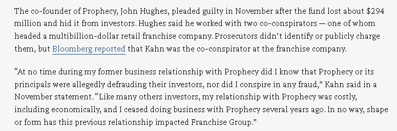 3.) Sure whatever, anything can happen. Again the thesis is unfalsifiable: “Hughes rolled on Kahn, Kahn will roll on Bryant Riley, and Bryant will take us right to the real ringleader!” Reiterating: separate and distinct legal entities are separate and distinct for a reason. Why would Vintage pay a 12% PIK note if, at the end of the day, these guys are all in cahoots or something like this? Why wouldn’t Kahn try to bilk some 3rd-party margin lender to lend against Vintage’s FRG shares? Even if the worst is true about Kahn (he knowingly acquired a personal stake in FRG with direct ponzi proceeds stolen out of Prophecy), how is this RILY’s problem? The margin loan, sure, probably a loss, but RILY owns 1/3rd of FRG direct out of their principal book. What does that have to do with price of tea in China?
